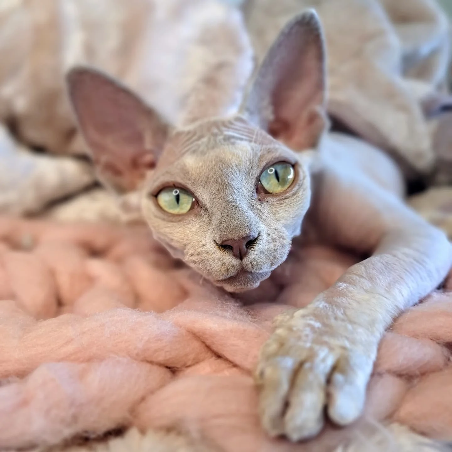 Sweet Venus is a friendly, cuddly affectionate girl who loves to stare deeply into your eyes and compel you to pat her to her heart’s content. She is a stunning, very hairless, orange eyed beauty.